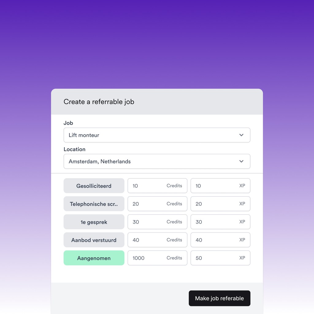 Laad eenvoudig banen in uit je ATS. Kies een beloning per sollicitatiestap. Maak de baan referable, en maak van elke medewerker een recruiter.